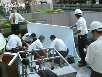 現(xiàn)場(chǎng)為國(guó)金一期商場(chǎng)的平臺(tái),13日下午5時(shí)許,事主在3樓由工友協(xié)助下,登乘一艘鐵斗式的清潔吊船,隨后有人推開(kāi)活動(dòng)的玻璃幕墻,擬將吊船推出大廈外墻之際,吊船突然失控跌下平臺(tái)。