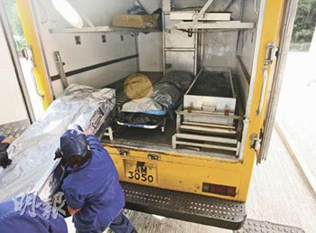 梁氏一家三口送院搶救后均不治,仵工其后將三具尸體一并送往殮房。(圖片來源:明報)