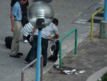 探員檢走中槍疑人的染血長(zhǎng)褲。(圖片來(lái)源:大公報(bào))