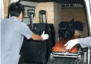 仵工將裝有碎尸殘軀的膠袋及旅行箱搬離現(xiàn)場(chǎng)。(圖片來源:澳門日?qǐng)?bào))