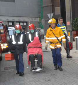 消防員接報趕到,在地面張開救生氣墊戒備,又派員上天臺嘗試走近游說,但事主一直情緒激動,無法收效。其妻子及女兒接獲通知趕到現場苦苦相勸,但不見效果,就在他與妻女傾談分神之際,在場消防員乘其不備撲前將他救返安全地點,不致釀成悲劇。事主沒有受傷,后在妻女陪同下由救護車送往廣華醫院檢查。事件擾攘約半小時。