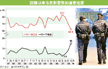 廖也說:“由于市民對公務(wù)員、公職人員要求高,加上以往警方滿意度都很高,稍有行差踏錯,影響便會較大,相信在近期事件影響下,市民要一段時(shí)間才能回復(fù)信心。”