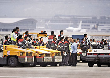 上月底,因為資方停發“工作表現獎”,機場地勤服務公司員工進行歷時3小時的“警示式罷工”,半癱瘓機場6小時;在香港勞工處斡旋下,勞資雙方5日進行談判。