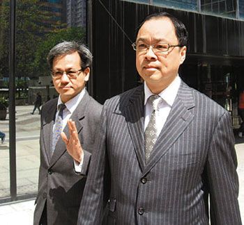 麥當勞香港一哥劉士盛(右前)涉非法收取回傭罪名成立,押后至下月宣判。圖為他早前出庭應訊后離開。(圖片來源:文匯報)