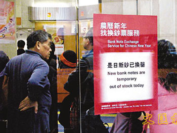 中新網1月14日電 據香港《文匯報》報道,春節將至,香港市民又要為換新鈔“封利是”張羅。每年春節前夕,相關單位都會加印鈔票供市民使用,香港銀行14日起為客戶提供新鈔兌換服務,有新印及回收的新簇舊鈔兩款以供選擇,各面額鈔票的供應量會與去年相若,料有3至4億張不同面值的新鈔供應。