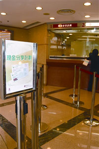 圖:銀行設(shè)置“現(xiàn)金分享計劃”兌票專窗。(圖片來源:澳門日報)