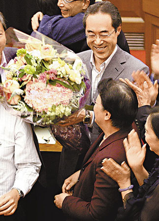 唐英年在告別議案結束后,代表特區政府向范徐麗泰送上鮮花,以表示謝意。(圖片來源:文匯報)