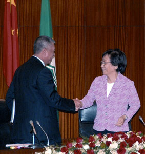 答問(wèn)會(huì)結(jié)束,何厚鏵與曹主席握手。(圖片來(lái)源:澳門(mén)日?qǐng)?bào))