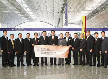 圖為港專聯臺灣訪問團離港時,中華旅行社總經理楊家駿(左6)及遠東貿易服務中心主任嚴重光(左8)到機場送行。(圖片來源:文匯報)