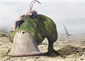 在霍金的宇宙中,火星、月球等類地行星上生活著兩只腳的食草動物。它們能利用吸塵器般的巨型嘴巴從巖石的縫隙中吸食食物。類地行星上還存在類似蜥蜴的食肉動物,雙方偶爾爆發獵食大戰。