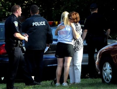 8月3日,在美國康涅狄格州曼徹斯特,工人和親屬在槍擊事件發生后相互安慰。