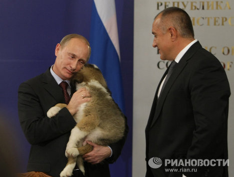 中新網11月15日電 據俄新網報道,11月13日,保加利亞總理鮑里索夫在索非亞與俄總理普京舉行會談。在會后的新聞發布會上,鮑里索夫將一只保加利亞牧羊犬贈送給普京。