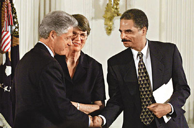 資料圖:霍爾德(右)曾在克林頓(左)政府時(shí)期,擔(dān)任司法部副部長(zhǎng)。