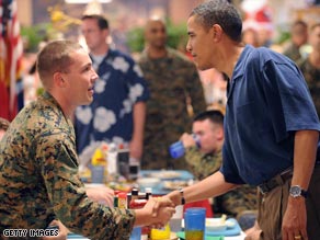 據CNN報道,正在夏威夷休假中的美國當選總統奧巴馬,昨天慰問了當地一海軍陸戰隊基地,并和駐扎在那里的士兵及士兵家屬共進圣誕晚餐。奧巴馬在美國海軍陸戰隊駐夏威夷瓦湖島(Oahu)的軍事基地里與士兵們一起共進了一個有火雞,烤牛肉,火腿和香腸的傳統的圣誕晚餐。