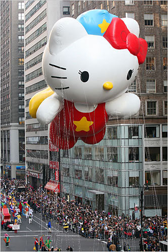 今年有11個大氣球加入游行,其中包括在天上飄的凱蒂貓(見圖),吸引現(xiàn)場所有人的目光,多達800名小丑和11支樂隊,以及2000名拉拉隊員和舞者,將整個游行氣氛推向高潮。 一位紐約市民幽默的說:“我喜歡的是最后會出現(xiàn)的耶誕老人,因為這樣我們可以趕快離開,然后回家開始吃火雞!”