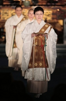 中新網(wǎng)12月16日電 綜合報道,日本東京的筑地本愿寺(Tsukiji-Honganji temple)迎來了一場特殊的時尚走秀。約40名日本僧侶在寺中搭起T形臺,身著各色僧侶服裝進行展示。舉辦此次活動的僧侶們表示,他們這樣做是為了弘揚佛教文化,吸引年輕人關(guān)注佛教。
