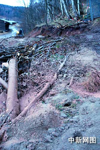 冷風(fēng)吹動紅白相間的警戒帶,推土機(jī)挖掘出的一條大約3米寬的斜坡路旁邊橫七豎八地倒臥著被伐倒的樹木,路邊和路中間“探寶”留下的的鉆孔清晰可見。斜坡上一塊大約10多平方米的平地上連著至少鉆了4個(gè)洞孔,每個(gè)間隔只有60厘米,四周散落著淡紅色的巖石粉末。
