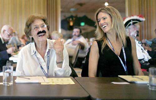 裁判艾米麗•瑪莎(圖左)戴著假胡子,和羅莉•麥妮爾一起在賽間大笑