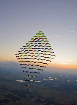 據(jù)報道,為實現(xiàn)這一絕技表演,100名跳傘隊員進(jìn)行了7年的計劃和訓(xùn)練。他們從5架不同飛行高度的飛機(jī)上跳下,在美國佛羅里達(dá)幾千英尺外的高空上拼成巨大的菱形,表演壯觀驚人,引人注目。
