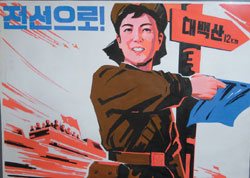 二00七年夏天,朝鮮當代畫家作品和國家畫室制作的宣傳海報在倫敦La Galleria首展時,現場掛滿了朝鮮紅色的旗幟,英倫天空從來沒有那么朝鮮。
