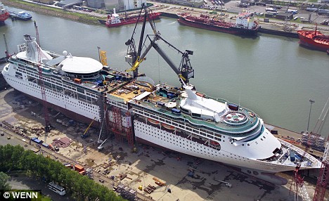中新網8月26日電 綜合報道,把游輪“一刀兩斷”,然后再塞進去一節(jié)船艙,繼而拼裝成一艘“擴大版”的客輪,這樣的“大刀闊斧”可不是幻覺,這艘長916英尺游輪的主人確實將船鋸開,要將其再擴展73英尺。