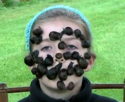 現年9歲的狄安娜•沃爾頓,喜歡動物。當25只蝸牛在她的眼睛、鼻子以及嘴巴上橫行時,她絲毫不害怕。由此,她打破了由澳大利亞人Liam Kenny支前保持的15只蝸牛上臉的前世界紀錄。