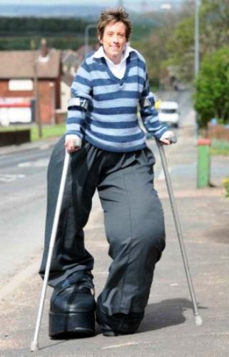 讓她的家人驚訝的是,她在整個童年時期,兩條腿的生長速度都一直比其它身體部位快!最后她再也不能獨立行走了。現在她要借助拐杖,或者借助一輛經過特殊改裝的汽車才能出行。塞拉斯的家在英格蘭西北部,她一直找她們家附近的一位鞋匠定做鞋子,因為她的兩只腳也畸形發育,右腳長16英寸(40.64 厘米),寬7英寸(17.78 厘米),但是她的左腳長僅有11英寸(27.94 厘米),而且整個腳是反長的。不僅如此,塞拉斯的兩條腿長度也不一樣。因此每定做一雙鞋,她都要仔細試穿,反復試穿直到最后確定鞋樣,整個過程需要花費幾周時間。定做這樣一雙鞋的費用大約是4000美元,塞拉斯必須籌集這些錢,因為她沒有工作。