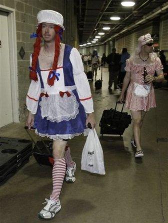 中新網9月25日電 綜合報道,美國奧克蘭運動家隊這個賽季表現很糟糕。24日晚,在阿靈頓的一場棒球比賽中,他們輸給了德克薩斯騎警隊。根據球隊的傳統,新秀球員要穿著搖曳的女裝回家。