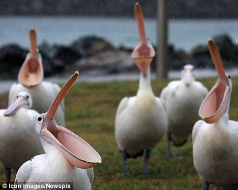 澳洲數只鵜鶘同時張開喙接雨水
