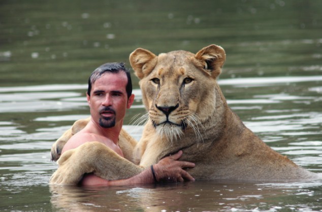 和他一起游泳的獅子Meg ,體重185公斤,是個愛好游泳的獅子。