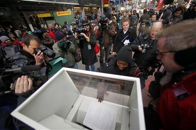 第三屆“大掃除日”(Good Riddance Day)前天在紐約時報廣場(Times Square)舉行,現場碎紙機轉個不停,一年來的厄運也象征性的一掃而空。