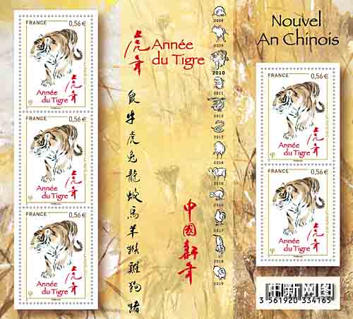 這是繼發(fā)行雞年、狗年、豬年、鼠年和牛年紀(jì)念郵票之后,法國第6次發(fā)行中國農(nóng)歷生肖紀(jì)念郵票。
