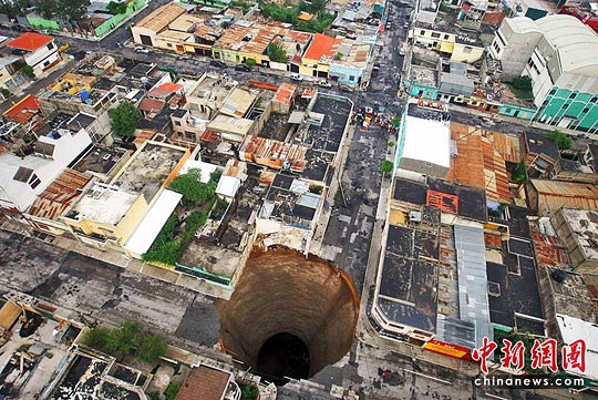 此外,受連場暴雨影響,危地馬拉城一處出現地面下陷,形成一個深60米、直徑30米的地洞。據報道,這個巨大地洞吞噬了一幢3層高大廈,1人死亡。