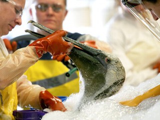 中新網6月9日電 據美國媒體報道,墨西哥灣漏油給當地鳥類帶來致命影響,美國路易斯安那州的一間倉庫已被用來清洗被原油包裹得無法動彈的海鳥。志愿工作者穿著防毒護具,一遍又一遍擦洗海鳥身上的深色原油。