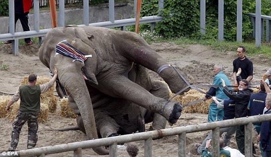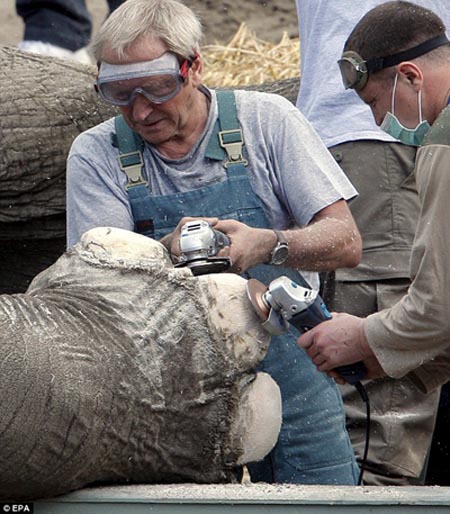 這只名為“男孩”的亞洲象今年已經(jīng)39歲了,他的腳趾甲太長了以至于他一直感覺很不爽,動(dòng)物園的工作人員看在眼里疼在心上,專門花重金從德國請(qǐng)來一名獸醫(yī)和他的多位助手,為“男孩”修理指甲。