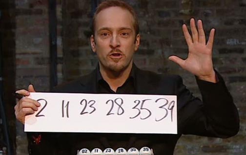 英國電視臺現場直播了當期彩票的開獎過程,由機器隨機選擇箱子中的球。而在另一個演播室,放置了一臺電視播放開獎過程。這位身處另一演播室的神秘“幻術師”在結果出來之前,就背對電視寫下了一組數字,分別是2、11、23、28、35和39。結果證實,他所預測的數字與中獎結果完全一致,令人瞠目結舌。