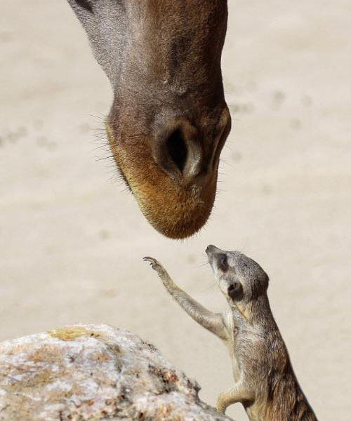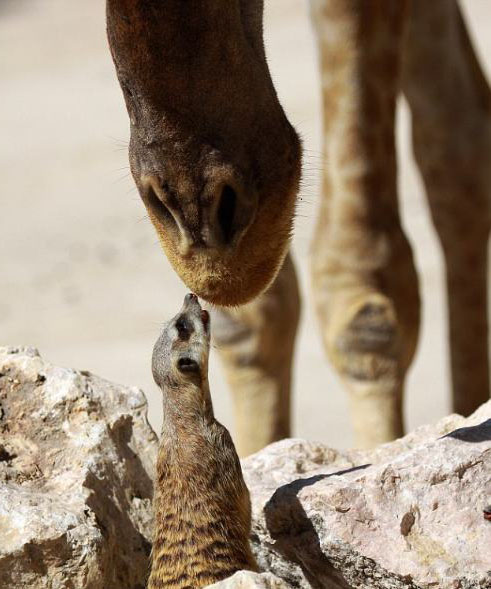 中新網(wǎng)2月22日電 據(jù)臺(tái)灣“今日新聞”22日援引英媒報(bào)道,看過(guò)動(dòng)物星球頻道的《狐獴大宅門(mén)》嗎?這里有該頻道沒(méi)辦法拍到的畫(huà)面──攝影師阿方索帕茲(Alfonso Paz)在葡萄牙里斯本動(dòng)物園直擊,一只厚臉皮的狐獴(又稱貓鼬),竟主動(dòng)向長(zhǎng)頸鹿索吻!逗趣的一瞬間也被拍了下來(lái)。