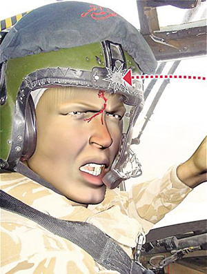 當時塔利班分子的攻勢很激烈,直升機盤旋良久才逮到一個交火較少的機會降落下來,不過當傷員陸續登上直升機時,對手的襲擊又開始活躍起來。當傷員接載完畢,伊恩冒著彈雨再起飛時,一粒子彈剛巧擊中他的頭盔前部一塊用于安裝夜視鏡的金屬架,子彈從這里穿透了頭盔,射中他的眉心。鮮血從伊恩的額頭涌了出來,一直流到他的眼睛。此時更多的子彈射了進來,支奴干的控制臺被擊中,穩定系統無法工作。但伊恩仍然努力控制直升機,繼續飛行了大約8分鐘,順利降落基地。空軍消息人士說,如果子彈射低一毫米,又欠缺這位機師的駕駛技術,機上所有人相信無機會生還。