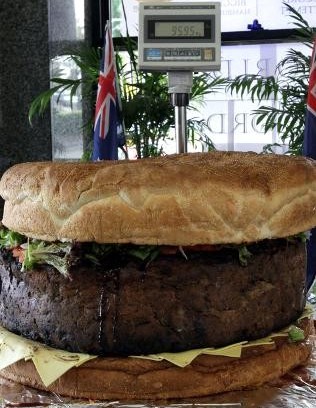 這個巨型漢堡包中間內容是由一塊巨型肉餅、120個雞蛋,150片奶酪,1.5公斤甜菜,2.5公斤西紅柿,將近2公斤生菜,還有一種特殊的醬汁做成的。