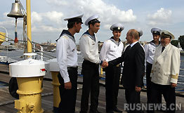 中新網7月13日電 俄新網消息,俄羅斯總理普京12日參觀了訓練用"和平號"帆船,該船在格丁尼亞-圣彼得堡國際帆船大賽第一賽段摘得了桂冠。普京是乘坐快艇登上帆船的。