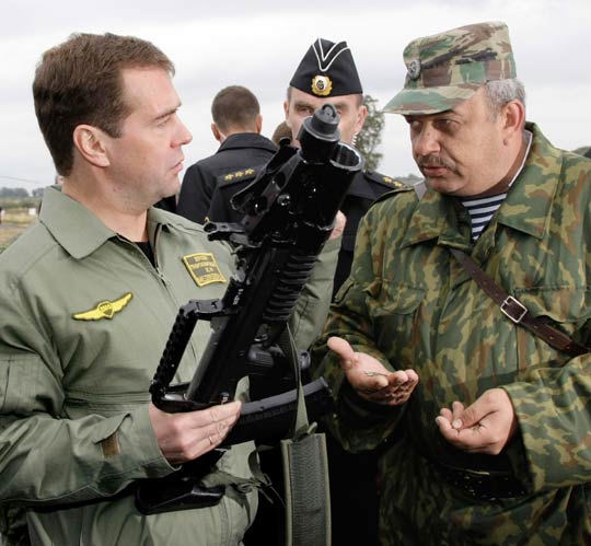 據英國《每日電訊報》28日報道,近日,俄羅斯正同白俄羅斯在加里寧格勒地區展開聯合軍事演習。俄羅斯總統梅德韋杰夫也身著軍裝出現在演習現場,他甚至端起一把機槍,并且用雙筒望遠鏡觀看演習情況,展現自己的硬漢形象。