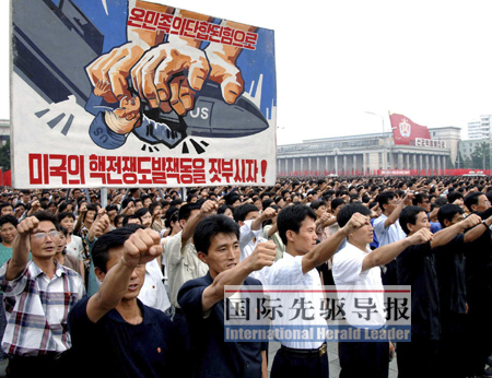 今年的6月25日是朝鮮戰(zhàn)爭爆發(fā)59周年紀(jì)念日,也是朝鮮的“反美斗爭日”。前兩年,朝鮮在平壤體育館舉行規(guī)模相對較小的“反美斗爭日”群眾大會(huì),而今年則改在金日成廣場舉行,參加大會(huì)的人數(shù)達(dá)到10萬名。《國際先驅(qū)導(dǎo)報(bào)》記者應(yīng)邀參加了這次大會(huì)。偌大的廣場上紅旗招展,人頭攢動(dòng)。“消滅朝鮮人民的不共戴天的敵人——美帝侵略者”、“趕走美帝,統(tǒng)一祖國”、“在反美大決戰(zhàn)中顯示英雄的朝鮮人民的本色”等標(biāo)語和宣傳畫隨處可見。