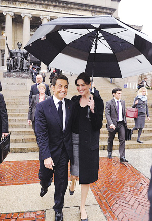 法國娛樂雜志的網(wǎng)站用頭條報(bào)道薩科齊夫婦到訪紐約,紐約給了薩科齊在自己的國家,也好久沒有感受到的關(guān)注,哥倫比亞大學(xué)學(xué)生的熱情,更讓薩科齊心情大好,他放棄事先準(zhǔn)備好的講稿,改說肺腑之言。從薩科齊在哥倫比亞大學(xué)演講的安排,就可以看得出來法國人是多么注重外在美。薩科齊在哥倫比亞演講的白色講臺(tái)和通往講臺(tái)的淺灰色地毯,都是他自己從法國帶去的。薩科齊穿深藍(lán)西裝、打黑領(lǐng)帶,布呂尼穿黑上衣、配灰裙子,加上黑白相間的花傘,看得出來是經(jīng)過刻意搭配,和地毯與講臺(tái)呼應(yīng)。