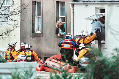 英格蘭西北部小鎮(zhèn)科克茅斯有10戶家庭同外界失去聯(lián)系,當(dāng)?shù)孛襟w報(bào)道,一些受困災(zāi)民被迫敲開(kāi)屋頂,爬上高處以躲避洪水。