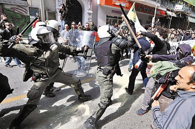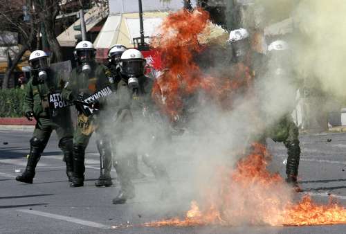 其中在雅典中部有三萬多人示威,于國(guó)會(huì)大樓外等多處地方,示威者向防暴警察投擲石塊和汽油彈,放火燒車和垃圾桶,又破壞銀行、珠寶店、戲院等10多間商店,警方發(fā)射催淚彈和手榴彈驅(qū)散人群。
