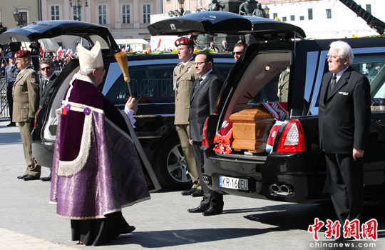 當天早些時候,卡欽斯基夫婦的遺體由軍方飛機從首都華沙運至克拉科夫,葬禮結束后,夫婦二人的遺體將被運往當地有著上千年歷史的瓦維爾宮安葬。