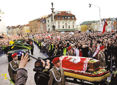 當靈車緩慢穿過克拉科夫狹窄街道時,哀悼者為卡欽斯基夫婦鼓掌、拋花和揮舞波蘭國旗?J斯基夫婦的遺體,是用飛機從華沙運抵這里的。