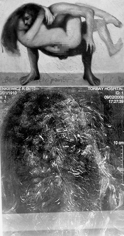 中新網(wǎng)6月23日電 據(jù)香港《文匯報》23日援引外電報道,英國一名藝術品收藏家于2003年以8500英鎊買入一幅已故畫家羅伯特-林克維科茨與女模特兒赤裸的自畫像(上圖)。該名收藏家聽取專家意見,把畫拿去醫(yī)院進行X光掃描,竟發(fā)現(xiàn)畫中有畫,油畫之下蓋另一幅流浪漢肖像畫(下圖),之前從未被拍賣過,估計價值逾5萬英鎊。收藏家相信羅伯特-林克維科茨用畫蓋另一幅畫是另有目的。