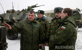中新網1月15日電 據俄新網14日報道,俄羅斯總統德米特里·梅德韋杰夫由國防部長陪同在莫斯科州參觀了新式履帶式裝甲運輸車。
