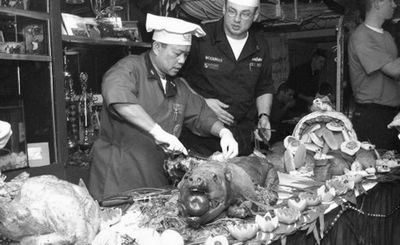海軍官兵還特別期待一些能飽口福的“特殊的日子”,比如在生日會、少數(shù)族裔晚宴、星期天午餐會、“墨西哥煎玉米餅餐會”和“冰激凌聯(lián)誼會”上總能吃到許多可口的特色食物。此外,每天早上廚房還會烤出成箱的餅干送往各部門,這也很受士兵們喜愛。米爾斯和法度透露,航母上士兵們最喜歡的是一道名為“海浪和草地”(龍蝦和烤牛肉,作者注)的套餐,不過這種奢侈品一個月只能提供一兩次。此外,“斯坦尼斯”號的招牌菜“龍蝦天婦羅”也同樣受歡迎。